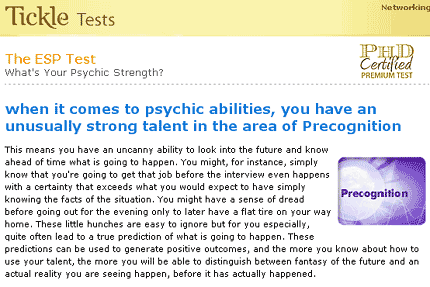 On top of having a strong talent in Precognition in-depth analysis also shows I have other hidden psychic strengths including retrocognition (the ability to know what has happened in the past), telepathy (the ability to sense people's true thoughts) and clairvoyance (the ability to see the unknown). How about that?